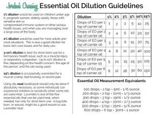 Coughs and Colds Blend: Mix 2 drops with a tsp of coconut or olive oil and massage over your chest area. May also apply to the base of your neck and the back of ears and neck at first signs of coughs or colds. Apply regularly every 1 1/2- 2 hours and you may lessen the symptoms. You may also use in diffuser necklace, tissue, or cotton ball. Even if you’re not sick, use when going out in public during cold and flu season for preventative measures. Be cautious with this blend around young children. Safe for children over 12, but use moderately; children 6 and older may use a 1% dilution (see the chart above).