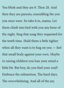 That last paragraph is well said. Regret for not taking the time to give your children the comfort they need isn’t worth the few minutes it takes to fulfill their request. Being a mom is the best job ever. I wish every woman would embrace it and men would embrace the role of father. Such a gift those roles are. Nothing compares to the satisfaction of being a parent. The hardest job but the best job!