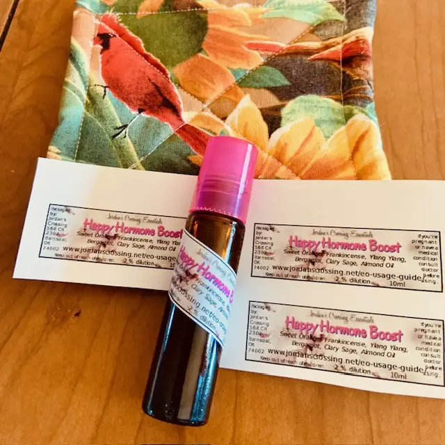 I originally put Happy Hormone Boost together to help me through the transitions of menopause. You know, hot flashes, night sweats, and mood swings (more like MOOD SWINGS ????), anxiousness, and wanting to alternately punch people or melt into a puddle of tears (all in the same 20 minutes). It helped tremendously, and got me past the worst of it. It’s made with eo’s of Frankincense, Ylang Ylang, Sweet Orange, Clary Sage, and Bergamot, all diluted with sweet almond oil.