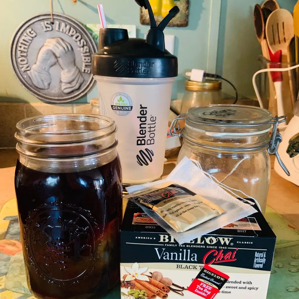 For ourselves, we most often just buy Oolong Tea in bulk as a loose tea and keep it in a jar. But we’ve used this Oolong too. You can often find it at a health store as well. I usually make a quart at a time, using approximately 6 tsp (which would be equal to 6 tea bags) and boiling water steeped overnight. That makes two Shrinkers and then to stretch it 2 more days, I add 1-2 Vanilla Chai tea bags (walmart again) to the jar and steep overnight once more.