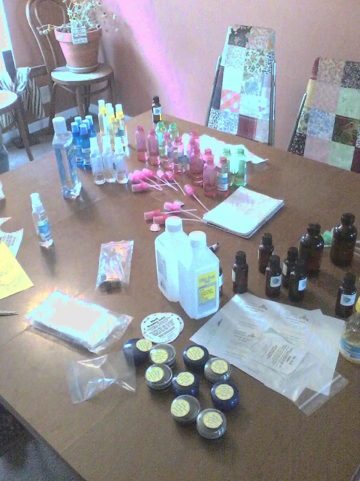 After coming back home from our wildcrafting endeavors, we ate some lunch and then started on making various sprays and salves for tomorrow’s market. One spray we can’t seem to keep in stock is our Shoo-Bug spray. Having just returned from camping, we can vouch that this spray really works! And for the times when we didn’t have the spray on, we can vouch that our No-Itch Salve really works! Lol. We didn’t have reason to use our Black Drawing Salve, bottlesbut it was a popular item for sale last week. Someone recently asked if black salve worked for snake bites. Yes! Have this stuff in your snake bite kit for sure! If you’re bitten, put half this container on the bite sight, then eat the rest of the black salve, and then call 911! (Not necessarily in that order). And yes, you heard right about eating the salve. Trust me, it won’t taste good, but can very much help to draw the poison from your system until you can get to help. Same is true for Brown Recluse Spiders and Black Widows.
